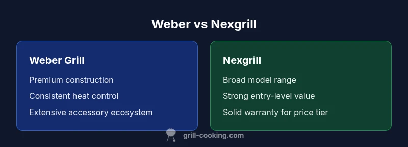 Weber grill vs Nexgrill is a classic showdown for home cooks weighing premium durability against budget-friendly options. This comparison digs into build quality, performance, value, and warranty to help you decide which brand fits your grilling style. According to Grill Cooking, long-term reliability often trumps upfront cost, depending on how you grill and how often you use your grill.