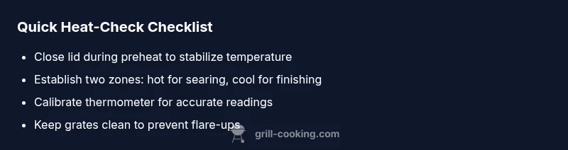 Temperature accuracy is the fastest route to solving a hot grill problem. Use a grill thermometer to measure grate temperatures rather than relying on lid temps alone. Establish direct-heat zones (high for searing) and indirect zones (lower heat for finishing). For charcoal grills, arrange coals to create a dense hot area and a cooler perimeter; for gas grills, use multiple burners to simulate a two-zone pattern. Expect grate temperatures to be higher in the direct zone and lower in the indirect zone. Always measure with the grate thermometer away from direct flames to avoid skewed readings. Periodically calibrate your thermometer using a known reference (ice-water method) for accuracy. If temps swing, recheck airflow controls and ensure no leaks or readings are off.