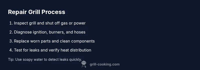 Goal: Learn how to repair a grill safely and effectively. This guide covers diagnosing common issues, choosing the right replacement parts, and steps to restore heat, flame control, and safety features. By following this process, you can extend your grill’s life and avoid costly service calls. According to Grill Cooking, a well-maintained grill enhances flavor and safety.