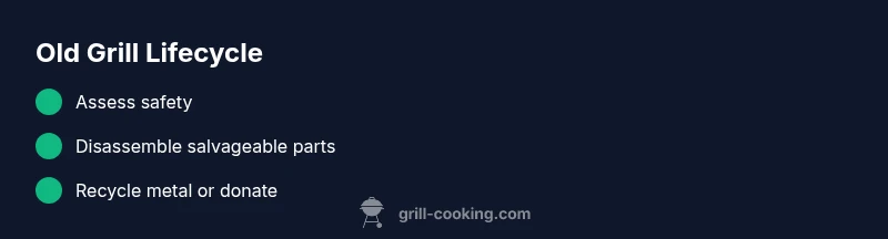 If you’re asking what to do with old grill, safety and stewardship should guide your decision. A neglected grill can corrode, leak gas, or harbor pests, turning a once-useful device into a hazard. According to Grill Cooking, responsible disposal or repurposing not only protects your family and yard but also reduces landfill burden. When you treat an old grill with care, you unlock practical options: salvage usable parts, donate a working unit, recycle scrap metal, or repurpose components for creative projects. This section helps you see the bigger picture: a responsible path enhances outdoor spaces and keeps you compliant with local rules. By starting with a brief safety check and a plan, you can navigate options confidently rather than hurriedly throwing everything away.
