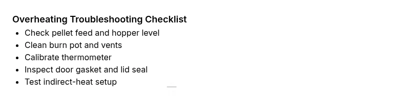 - Confirm pellet supply and clean the burn area. - Clean vents and verify lid seal. - Calibrate thermometers and compare readings. - Follow a controlled indirect-heat setup for long cooks. - Maintain a regular cleaning schedule to prevent future spikes.