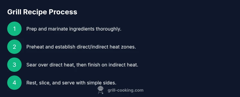 A clear plan makes the grilling process predictable. Begin with prep: trim, pat dry, and season the food. Preheat the grill and establish heat zones. Cook with direct heat to sear, then move to indirect heat to finish, using a thermometer for accuracy. Rest the meat briefly before slicing to preserve juices, and finish with a light glaze or finishing salt for balance. This sequence keeps you focused on technique rather than improvisation, which is essential for a repeatable recipe for grill.