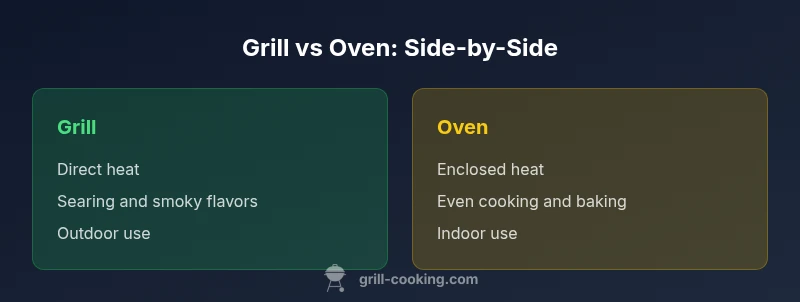 The difference between a grill and an oven is not just where you cook, but how heat is delivered, how flavors develop, and what culinary goals you can achieve. According to Grill Cooking, the core distinction lies in heat sources, cooking environments, and the resulting texture and aroma. A grill relies on direct heat from an open flame or charcoal, producing rapid searing and smoky notes that char the surface. An oven, by contrast, uses enclosed heat from coils or flames to create steady, all-around cooking. This enclosure allows fans and air circulation to move heat evenly, which is ideal for baking bread, roasting vegetables, and developing uniform browning. Understanding this difference helps home cooks choose the right tool for the dish and the context, whether you’re chasing a bold grill flavor or a precise bake.