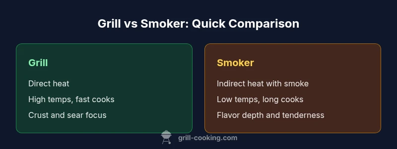 In everyday cookouts, the phrase difference between grill and smoker is more about intent than a strict device definition. A grill is typically a device used for high-heat cooking over direct flames, perfect for searing steaks, burgers, and vegetables quickly. A smoker, by contrast, emphasizes low heat and smoke, letting wood flavor infuse meat over longer periods. For home cooks, the distinction often hinges on heat management and time rather than the color of the smoke. According to Grill Cooking, clarity about your target results helps you choose the right tool and technique before you fire up the firebox. Understanding this distinction is the first step toward consistent results, whether you’re planning a weeknight burger or a weekend brisket. This guide uses the primary keyword to frame the discussion: the difference between grill and smoker is not just hardware, but approach and outcome. Modern grills and smokers can overlap in capability, but the core logic remains: heat vs smoke, speed vs patience, direct fire vs indirect air.