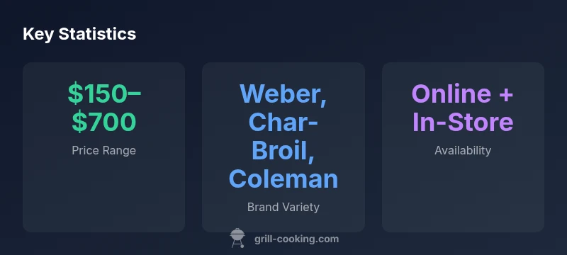 | Walmart | $150–$700 | Online orders with curbside pickup; in-store pickup | Weber, Char-Broil, Coleman, Blackstone, and more |