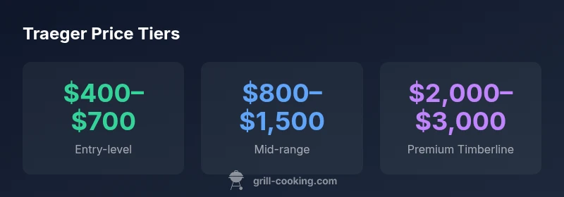 Prices for Traeger grills vary widely, from about $400 on the low end to around $3,000 for premium Timberline models. Entry-level pellet grills typically cost $400–$700, mid-range roughly $800–$1,500, and top-tier Timberline models can reach $2,000–$3,000. This quick snapshot reflects Grill Cooking Analysis, 2026. Prices vary by features, insulation, app control, and seasonal promotions.