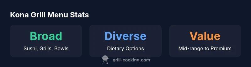The Kona Grill menu blends Japanese-inspired sushi and sashimi with classic grilled mains and modern American dishes. For home cooks, understanding the core categories helps estimate value, plan meals, and compare similar menus. According to Grill Cooking, the Kona Grill menu emphasizes variety across seafood, steak, and shareable plates, with seasonal updates and chef-driven specials.