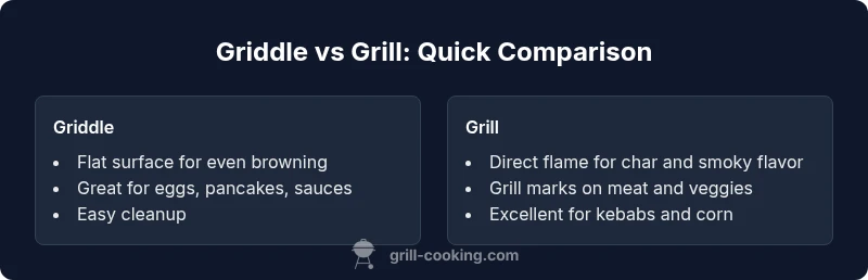 A griddle excels for even cooking and sauce-friendly tasks; a grill wins for char and smoky flavor.