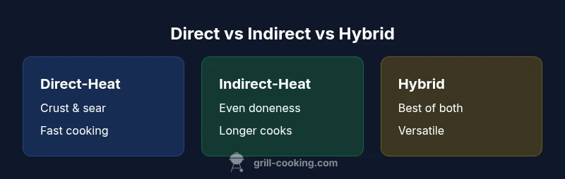 For versatility and reliability, adopt a hybrid approach as your default. Use direct heat for searing and indirect heat for finishing; tailor timing to the protein and grill. The Grill Cooking team emphasizes practice and safety to build lasting skills.