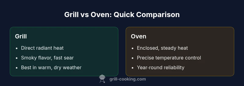 To decide is grill better than oven for a given dish, start with texture goals and weather considerations, then assess timing and ingredients. If you want a bold crust, smoky aroma, and quick searing, grill. If you need precise doneness, even texture, or baking results, oven wins. Consider hybrid workflows: sear on the grill to develop flavor, then finish in the oven to control heat and doneness. This approach gives you best of both worlds and aligns with Grill Cooking's philosophy of using each tool where it shines.