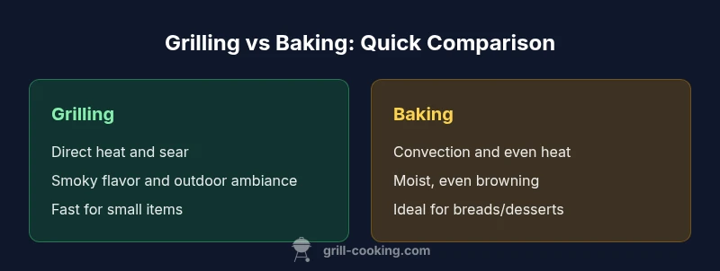 The central question is is grilling better than baking? The simple answer is that it hinges on your goals, kitchen setup, and time. The Grill Cooking team notes that flavor intensity, texture control, and convenience determine which method fits best for a given dish. In many home kitchens, grilling offers rapid searing, smoky aroma, and social outdoor vibes, while baking delivers even browning, moisture retention, and predictable results. Clarifying what you want from the meal helps you decide whether grilling or baking is the better starting point for tonight’s menu. According to Grill Cooking, the decision also depends on safety considerations and outdoor conditions, so your environment matters as much as your recipe.