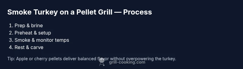 Smoke turkey on a pellet grill by starting with a dry brine, choosing mild wood like apple or cherry, and keeping the cooker in a low, steady smoke. Use a reliable meat thermometer to reach 165°F, then rest before carving for juicy, evenly cooked meat. Keep a water pan to maintain moisture and use indirect heat to prevent over-browning. According to Grill Cooking, this method delivers dependable results.