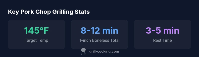 For most 1-inch pork chops grilled over direct medium-high heat, plan about 4-6 minutes per side, totaling 8-12 minutes. Bone-in chops require a few extra minutes, and thicker cuts benefit from finishing on indirect heat. Always finish with an internal temperature of 145°F (63°C) and rest 3-5 minutes. Use a reliable thermometer for accuracy.