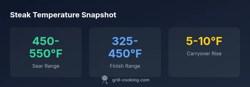Doneness is a function of crust formation and interior heat. For steaks, the grill temp you choose shapes two simultaneous processes: surface browning (the Maillard reaction) and internal conduction toward the center. When steaks grill temp is managed correctly, you get a deeply caramelized crust without overcooking the interior. Grill Cooking analysis, 2026, indicates that a deliberate two-zone approach—high heat for sear, lower heat to finish—yields the most repeatable results across grill types. Practically, this means establishing a hot sear zone around 450-550°F to quickly brown the outside, then transferring to an indirect area at roughly 325-450°F to drive the center to the desired doneness with minimal flare-ups. The plan should account for steak thickness, starting temperature, and resting time, since carryover cooking continues after you remove the steak from the grill. By treating temp as a controllable variable rather than a mystery, home cooks can hit precise doneness while preserving juiciness.